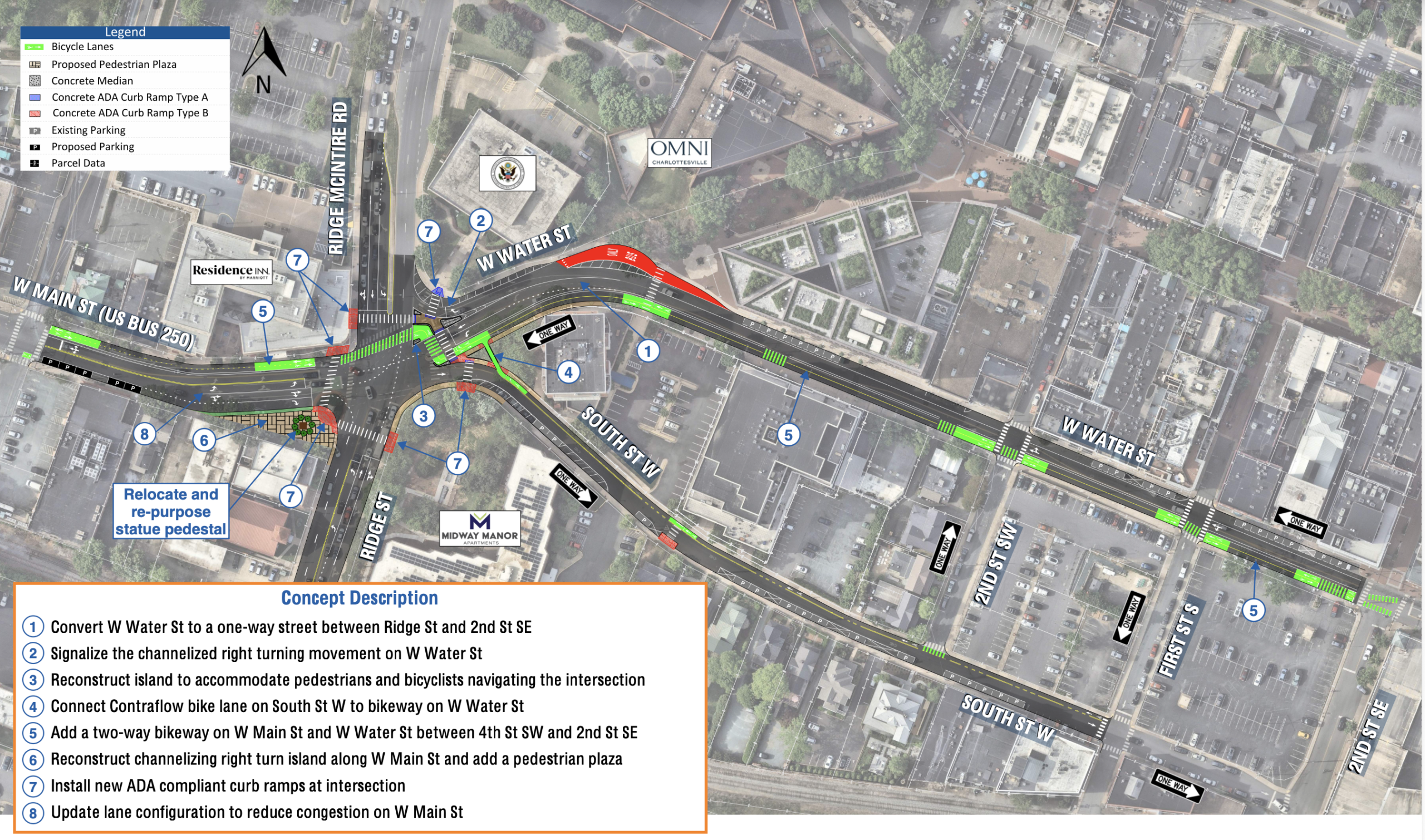 The plan would reserve the westbound lane of those three blocks of Water Street for cyclists only. It would extend a two-way bike lane across Ridge/McIntire onto West Main to Fourth Street SW. The plan would also eliminate the slip road leading to southbound Ridge Street, and move the plaza where the Lewis, Clark, and Sacajawea statue once stood to the north.