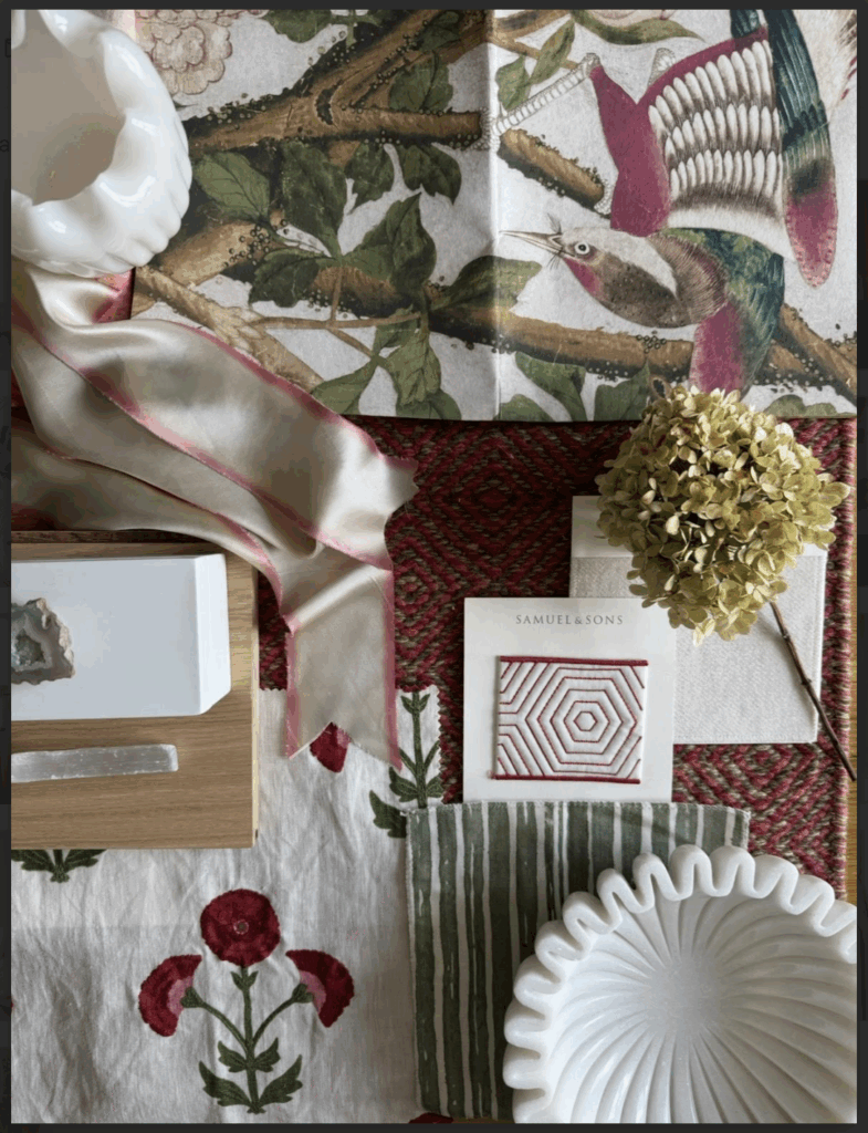 “We had so much fun designing this bedroom mood board for a young girl with a love of creativity and nature. This room strikes a balance between playful charm and thoughtful sophistication. The palette—blush, deep raspberry, and moss green—feels fresh yet timeless, setting the tone for a space that evolves with her. Botanical prints, embroidered trims, and layered textures reflect her personality, while natural materials like wood, stone, and dried florals bring warmth and grounding.
