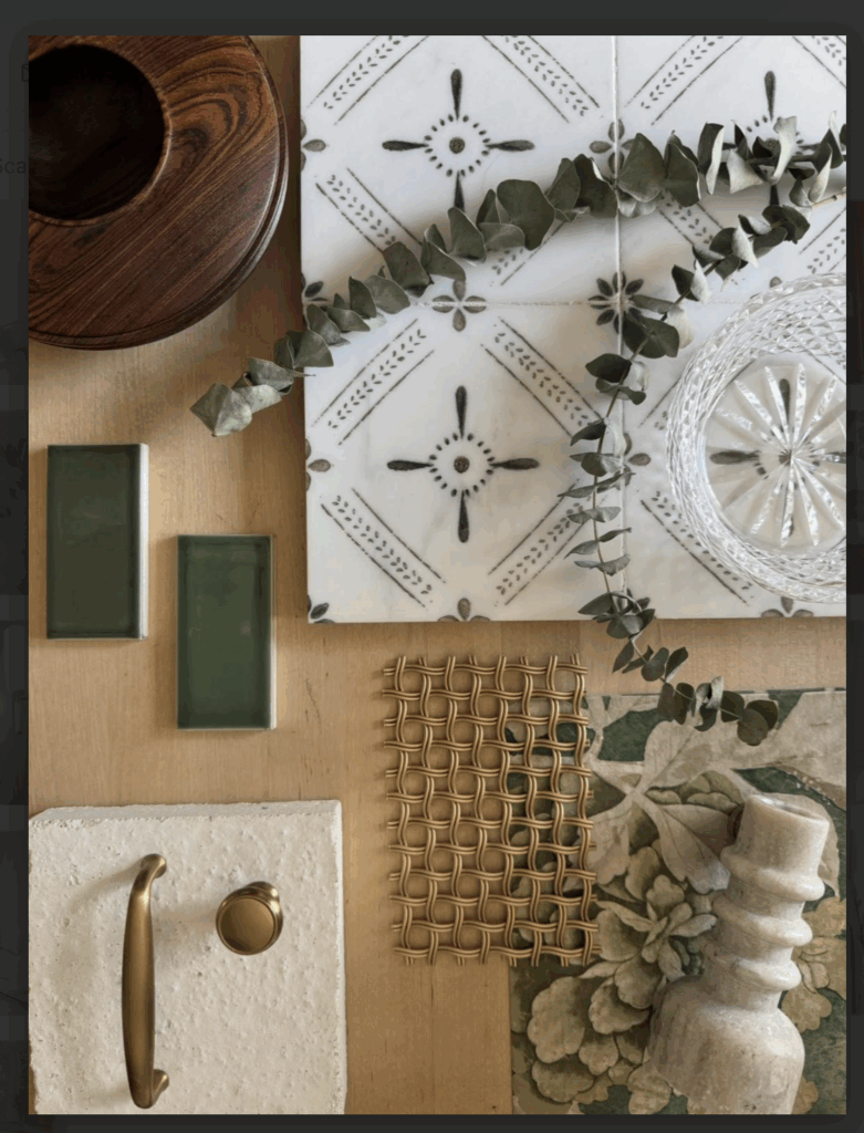 “This design board celebrates a worldly, collected approach to living—curated for homeowners who love art, travel, and storytelling. The vision began with a grounding palette of black, ivory, and deep red, chosen to infuse the space with both drama and warmth.