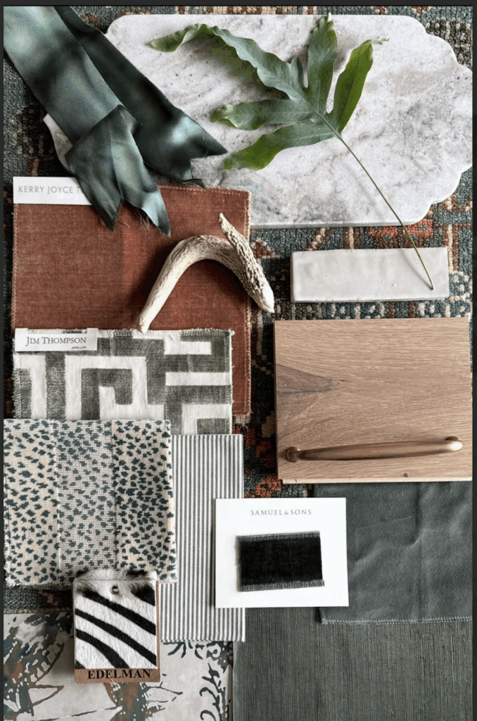 “Designed for a couple living in a historic home, this library and study concept balances classic charm with contemporary comfort. The palette combines rich earth tones—deep greens, warm rust, and natural wood—reflecting the home’s heritage while introducing a fresh, inviting atmosphere. Textural fabrics, from soft velvets to patterned weaves, add depth and tactile interest. Natural accents, like the antler and leafy greenery, subtly connect the space to the outdoors, enhancing its calm and restful feel. Subtle animal print accents and brass hardware inject personality and sophistication. We truly enjoyed designing this space, creating a cozy retreat perfect for savoring a good book and a cup of tea.”