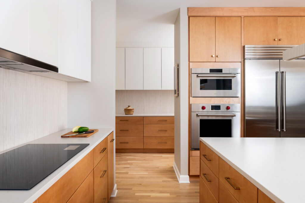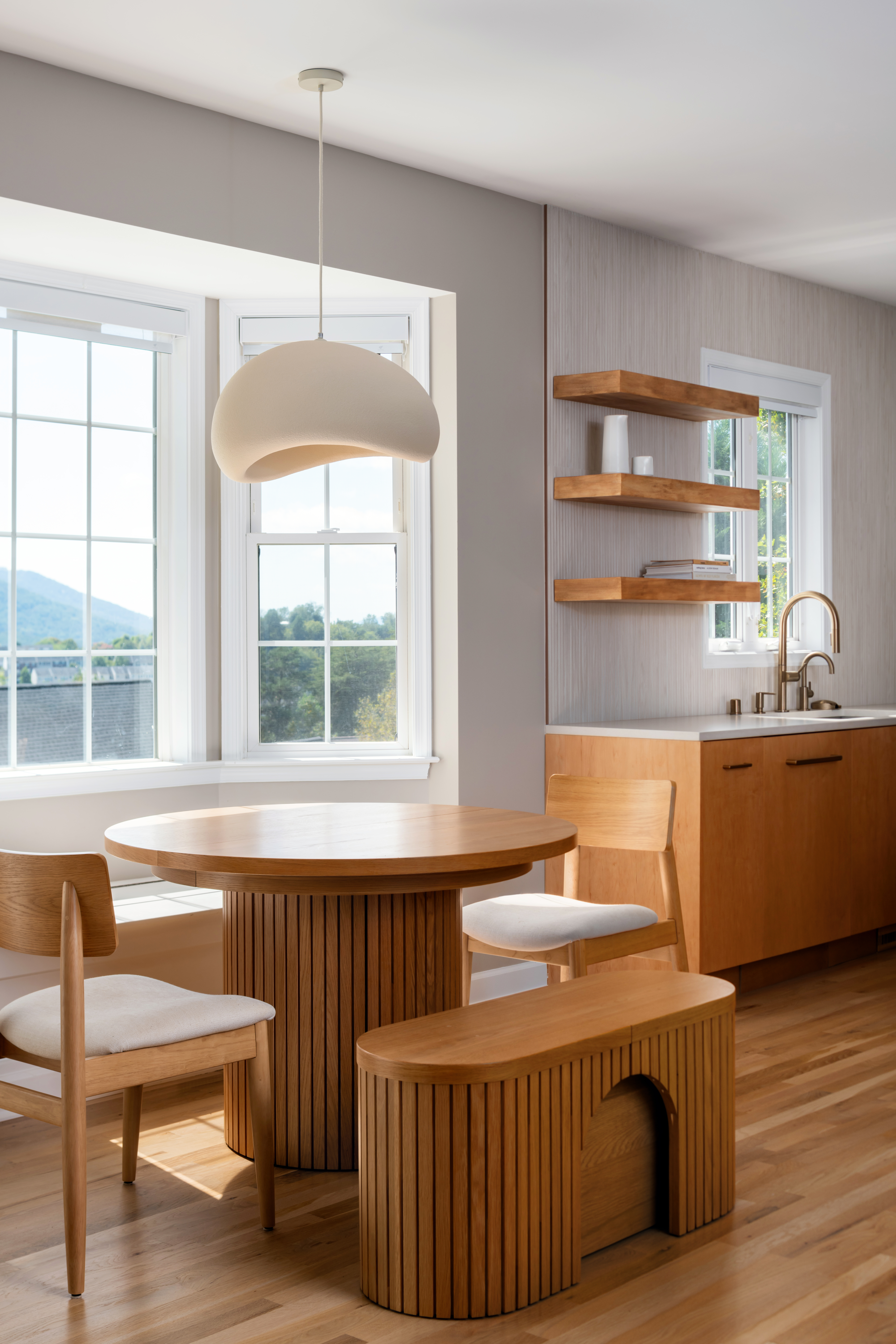 All this attention to warm neutral quiet means the kitchen area feels much lighter without the need to replace or enlarge any windows on the exterior wall. This is a hallmark of the Morrells’ approach to the project: using attention to detail to achieve custom quality while respecting budget parameters. The architects investigated a wide range of cabinet suppliers for textures, grains, colors, and installation time; they even tried out samples on site with the Wilsons at different times of day to check on color and compatibility.