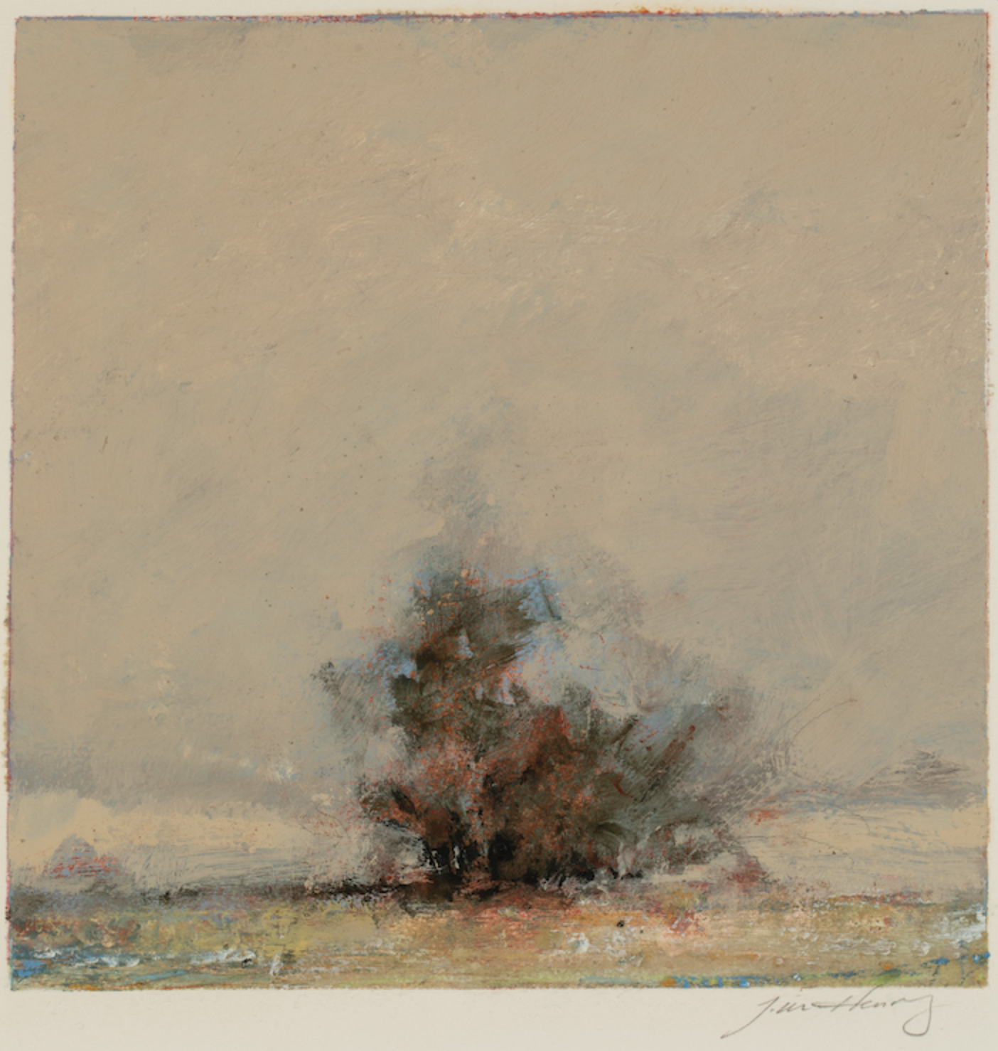 The curious form of one his small, untitled works—a fire? a dust devil?—depicts a figure largely composed of wind, dust, or smoke. Henry builds it up with masterly brushstrokes that describe its immateriality and sense of movement. He continues his virtuosic treatment of paint in the ground on which the mysterious form sits, where the marks of pigment coalesce into highlights and shadows and suggest the uneven contour of the earth. The superb artistry elevates this work of modest scale into something quite extraordinary.