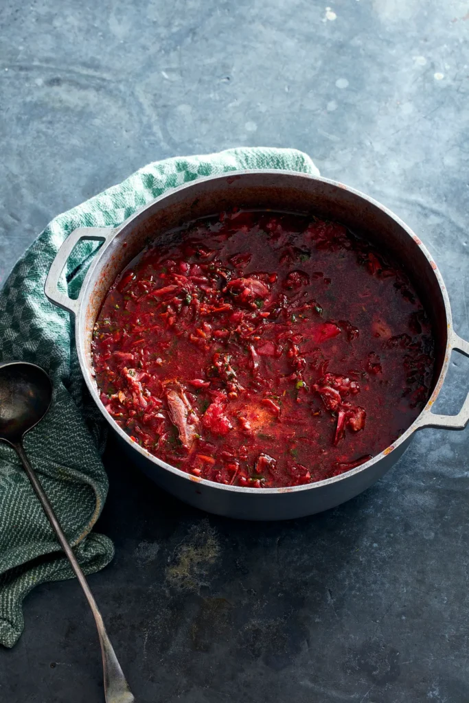 What I mean by that is adding lots of fresh herbs, garlic, and spices, which give dishes a lot more vibrancy and depth. You have these sort of Eastern European comforting, nourishing foods, but then you have the Georgian flavors coming through. In the borscht, you have your traditional dill, but you also have some spicy Anaheim pepper and red pepper flakes. You have lots of cilantro, sometimes a little bit of fresh garlic. In the stuffed cabbage you have your classic blend of beef and pork with a bit of rice, but then we add fistfuls of cilantro, dill, mint. The sauce is this chunky tomato, pepper, carrot sauce that is finished with lots of fresh herbs and garlic.