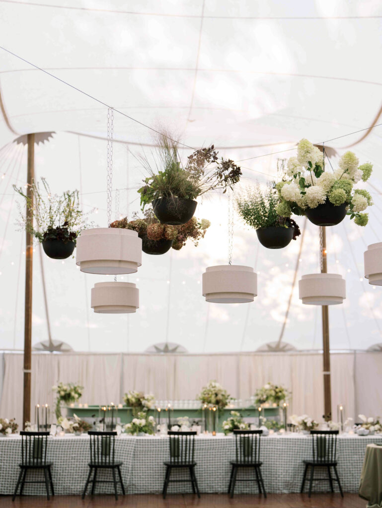 The linen pendants from Paisley & Jade set the tone, but it’s the hanging baskets filled with moody florals by Mallory Joyce Design that really steal the show. Suspended above Paisley & Jade’s Hudson chairs at The Clifton, they create a lush, dramatic canopy that makes the tables feel instantly, er, elevated.