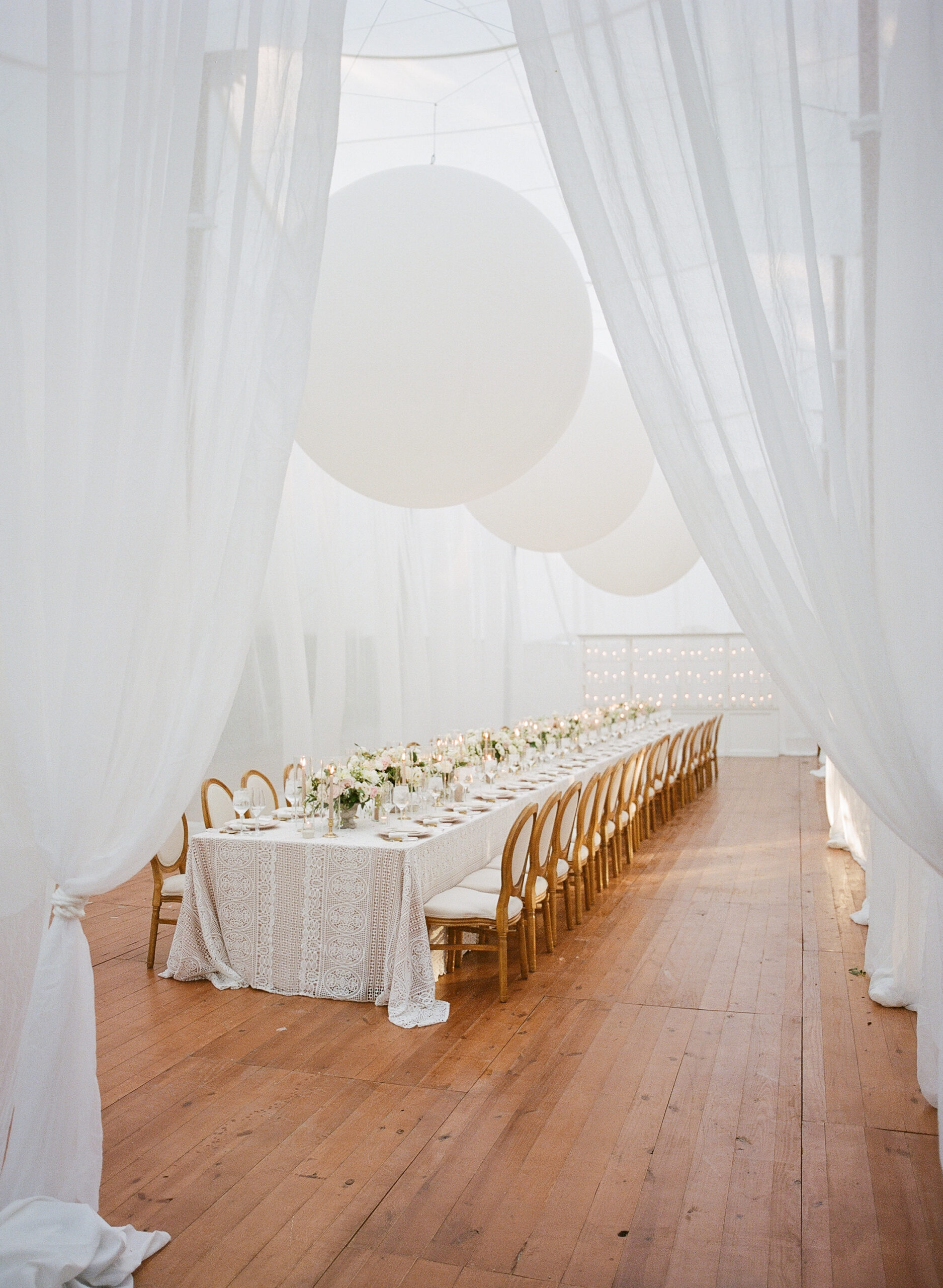 Giant white balloons hover above a long lace-draped table, turning a simple all-white setup into a dreamy, unforgettable scene. The clean lines and airy florals create a sense of lightness and whimsy, making this reception feel both intimate and magical.